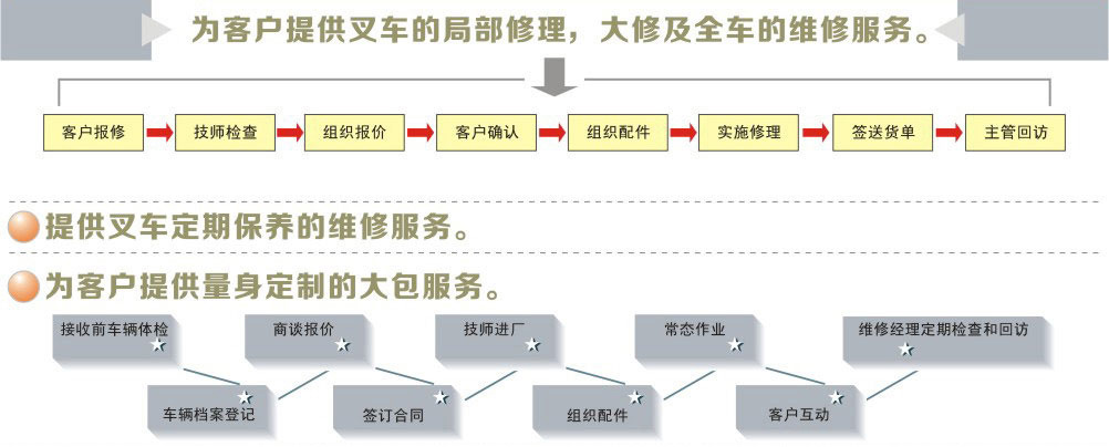 "精益求精"是我司服務客戶的主要信念。我司擁有600多名訓練有素的維修工程師,維修服務團隊強大。目前,我司還擁有160多名各類高級維修工程師,可全方位的為客戶提供日系,歐美系內燃叉車、、電瓶叉車的維修服務及故障解決方案。公司定期在國內舉辦技術研修課程,以確保維修服務人員得到最新的產(chǎn)品知識和技能學習。